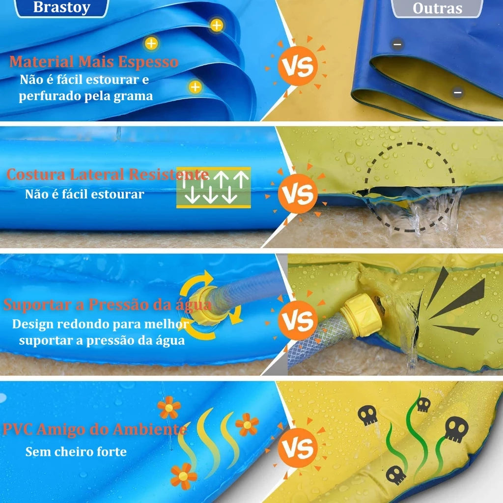 Material em PVC resistente, pensado para uso frequente e brincadeiras animadas. O tamanho de 170 cm oferece espaço amplo para correr, pular e se refrescar 👧🧒